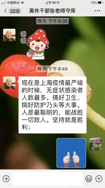 “上海这次疫情得到了党中央的高度重视,得到了全国各地的大力支援,我们应该充分利用这次机会,使祸国殃民的冠状病毒在上海早日清零,向战斗在抗疫一线的同志们致敬,你们辛苦了!上海加油!”