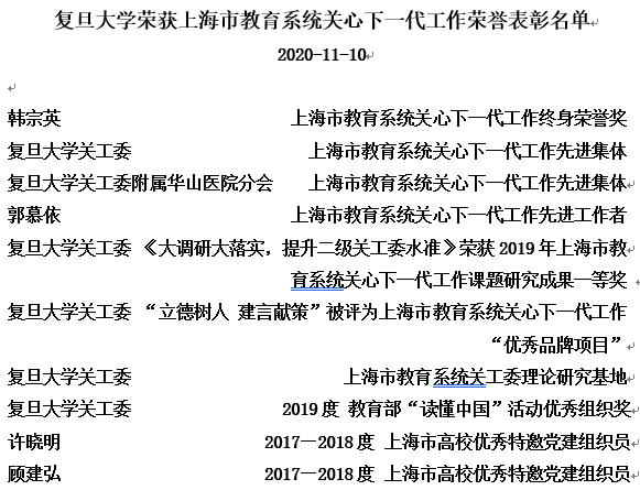 复旦大学关心下一代工作委员会荣获“上海市教育系统关心下一代工作先进集体”