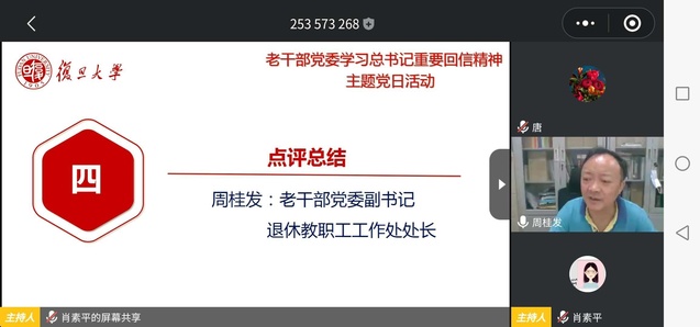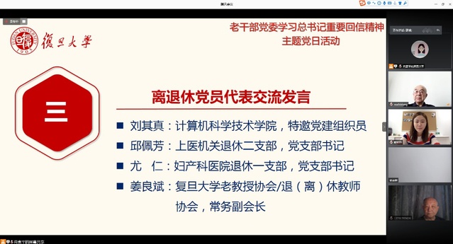 今天的线上老干部党委学习习总书记重要回信主题党日活动,我们在微视频焦扬书记的亲自引领下,再次逐字逐句地认真学习和领会了习近平总书记给复旦青年师生党员的回信。面对风云激荡世界百年未遇的大变局和民族复兴的战略复杂局面。焦书记祥细介绍了如何带领复旦人,坚定理想信念,学思践悟,奋发有为走好新时代的长征路。很受鼓舞和教育。