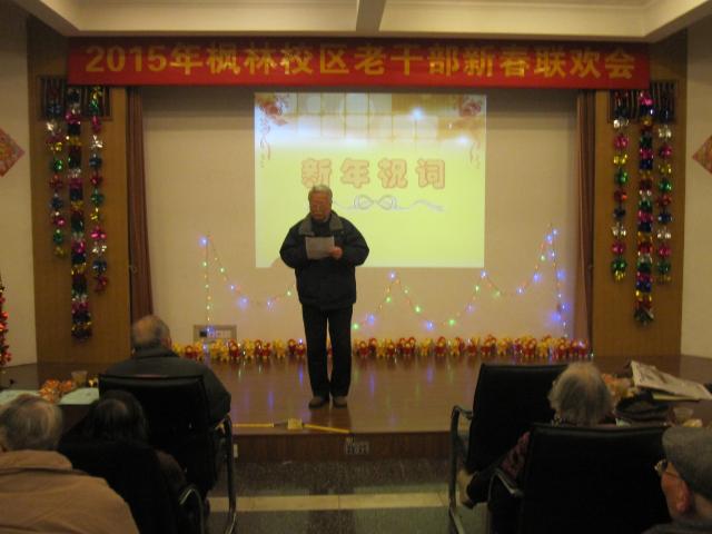 校党委副书记陈立民代表学校向老干部们送上新年最美好的敬意和祝福。当他得知在老干部群体中“90后”的已有17位时,激动的说道,看到老干部们饱满的精神风貌,健康乐观的生活情趣深感敬佩,这是学校的荣耀和幸事,作为晚辈,我们要为大家健康、快乐、长寿齐鼓掌,来加油。陈书记还借此机会就学校工作重点简要的向老干部们做了汇报。2014年对于学校来说是关键之年。经历了党的群众路线教育实践活动的洗礼和中央专项组的巡视,查找和发现了学校存在的主要问题,通过整改落实,学校的工作在各方面都有了明显的转变;枫林校区启动了大规模的改建工程,这是历史性的机遇,不久的将来会给我们带来一个全新的校园,一个更好更大的发展平台。让我们相信在新的一年里,国家会更加美好,学校的事业会更上一层楼,衷心祝愿老干部们阖家快乐,幸福安康。