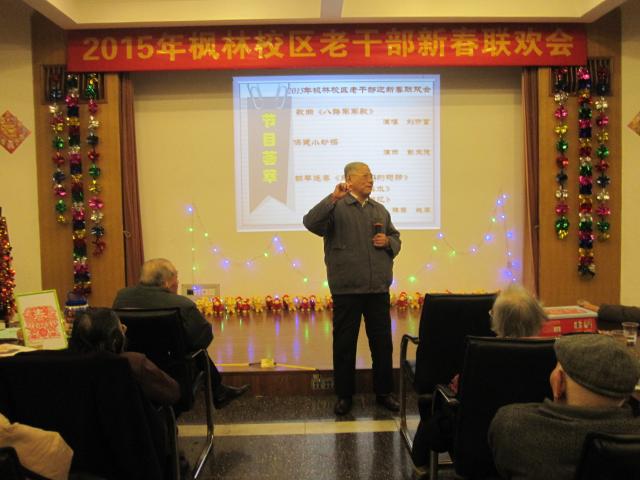 携着春的祝福,裹着爱的温馨,2014年12月30日上午,枫林校区老干部欢乐跨年,笑迎新春联欢会在治道楼八角厅隆重举行。会场内喜气洋洋,老干部们个个精神爽朗,问候声、祝福声、欢笑声此起彼伏,声声悦耳。校党委副书记陈立民来了,枫林街道的老干部工作同志来了,老干部处退休的工作同志也回到了“娘家”,与老干部们欢聚一堂,共同迈入幸福、祥和、快乐的2015年。