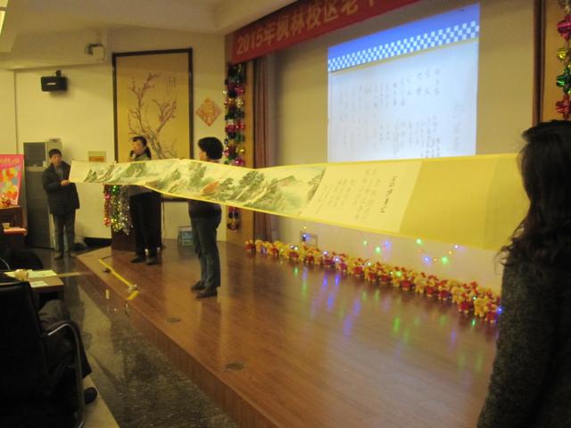 老干部对生活的向往和热爱;92岁的韩韬同志因病住院没有到会,但是他专门为联欢会写诗助兴,在《羊年元旦喜赋》中写道:窗外梅开景色妍,神州处处换新颜。政经改革花千树,旧友新交果满园。百业豪情辞马岁,全民励志奋羊年。四中更播摧花雨,大写复兴崛起篇。饱含深情的诗作字里行间流露着对实现中华民族伟大复兴中国梦的殷殷厚望;86岁的陈玉昆同志被老干部誉称为“画家”,每次联欢会上都有佳作展示,这次带来的作品题为《匡庐景汇》,这是他暑假期间到庐山度假时,用时两周所绘,将庐山秀甲的自然风光和丰厚灿烂的文化内涵都融入在了八米画卷中。但遗憾的是陈老师突患疾病住院,不能亲临会场,老干部们欣赏画作后,报以热烈的掌声表示赞赏,还在画卷上签了名,致使这幅画作华丽转身,成为了老干部集体的佳作;87岁的刘开富同志视力衰退,行动不便,但是他生活乐观,献唱的《八路军军歌》,激情豪迈,再现了一个老兵的奕奕风采。联欢会上节目精彩纷呈,有机关退休党支部带来的舞蹈《谁见过梦中的草原,梦中的河》、有彭玉德同志演示的《健康小妙招》、有老干部工作同志倪大伟讲述的《广西巴马长寿乡见闻》等等,历时二个半小时的联欢会在姚泰同志悦耳抒情的钢琴曲连奏曲《乘着歌声的翅膀》、《清澈的溪水》《童年的回忆》中结束。