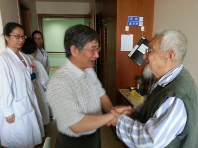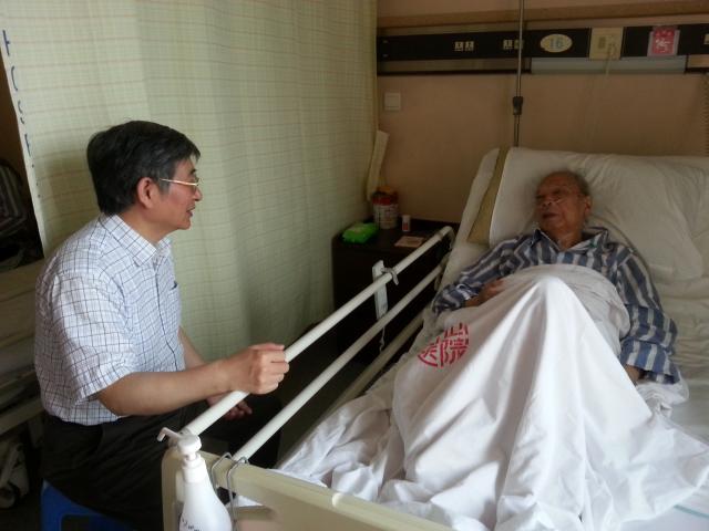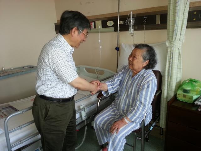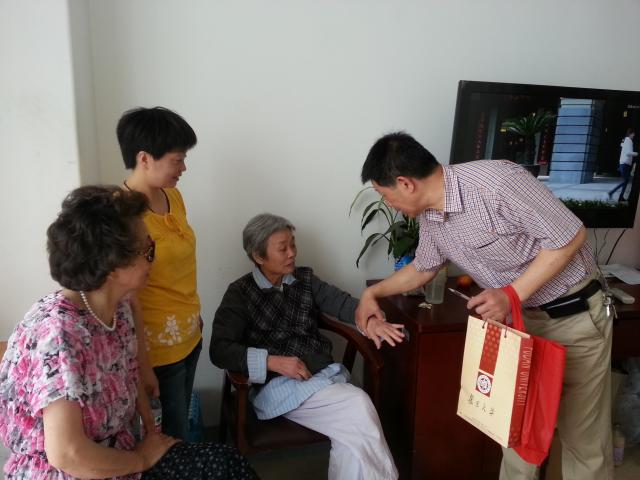 校党委副书记陈立民专门安排时间,与老干部工作同志来到中山医院,探望慰问了住院的老干部。来到身患重病的抗战老干部曹文明的病床边,陈书记俯身关切询问病情,鼓励他要树立信心,坚强面对疾病,曹老师非常感动,向陈书记低语喃喃地讲述了医院、医生、护士、组织及家人都在为救治他的疾病而忙碌着,自己感到十分过意不去。看到国家强大很是欣慰,对习近平总书记高超的执政方略和反腐倡廉的坚定决心由衷地感到敬佩。曹老师病魔缠身还关心国事,这令陈书记深为感动。为了解曹老师的真实病况,陈书记去了医生办公室,从医生口中得知曹老师病因详情,以及他因心理疾患而采取的非理性过激行为时,当即表示组织会配合医生共同做好曹老师的思想工作,并对医护人员的积极救治和人文关怀予以感谢;来到抗战老干部卫桑的病房,床位医生向陈书记介绍了卫老的病情,92岁的卫老记忆力很好,数年以前的事情都记忆犹新,他善于学习,还将学习体会,人生感悟写在卡片上与病友分享。陈书记握着卫老的手说道,今年是抗日战争胜利七十周年,学校将召开纪念大会,希望卫老安心养病,配合治疗,早日康复,届时能来参会;来到老领导王光正老师的病房,当得知90岁的王老师经过一段时间治疗,病情已经好转,下午就将出院时,真替她感到高兴。王老师感谢陈书记的关心,说自己多次患重病都是有赖中山医院帮助除去病痛的,医生们都很敬业,医术高超,能根据高龄老人不同体质,不同疾病特征对症治疗,医患关系相处和谐。陈书记夸赞王老师豁达、勇敢、坚强、乐观,是我们学习的好榜样。