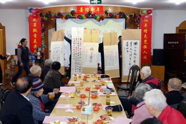 2015年是一个精彩、不平凡的一年。这一年,老干部学习活动开展有序,形式多样,内容丰富。隆重纪念中国人民抗日战争暨世界反法西斯战争胜利70周年系列活动成为这一年主要特色活动之一。组织收看大阅兵,召开纪念大会,举行颁奖仪式,抗战老兵展板巡展,观摩红歌联唱,观看文艺演出,参加专题书画展等等,无不珍爱世界和平,弘扬爱国主义精神。茶话会上,通过几百张照片编辑而成的《2015年老干部学习、活动和生活精彩回顾》演示文稿回放,还原了老干部们各类学习、活动的真实场景,也带来了许多不能来校参加活动的老干部们信息。会场上的老干部们看得认真专注,不由得回忆起曾经拥有的难忘时光。此外,会上还展出了张守庠、朱元寅、金兆良、汪幼兰四位老干部参加杨浦区老干部专题书画展的部分作品,供大家欣赏,受到在座的老干部们热烈欢迎。