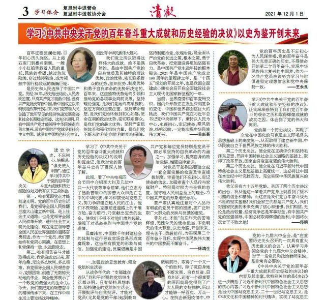 近期,复旦附中退休党支部组织党员线上学习《中共中央关于党的百年奋斗重大成就和历史经验的决议》,大家纷纷发言,热烈交流讨论,其中有18位党员认真撰写了书面发言稿,《清欢》报辟出专版刊登了党员们的学习体会。大家一致表示,纵观历史,我们党的每一次决议都洞察历史规律,掌握历史主动,汲取前行力量。我们共产党人高度的历史自觉和历史自信,使我们的党越来越强大。作为一名附中的退休党员,既要认真深入学习《决议》,不断充实和提高自身理论水平,也要主动关心附中教育改革将良好的师德师风传承下去,还要发挥余热为社会做一些力所能及的公益工作。