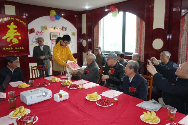 接着,中文系2014级同学代表为寿星们呈上自己的书法作品。一个个装裱精美的“寿”字送到老干部们手中时,老干部们非常开心。学生代表发言时表示,老干部们为国家做出的贡献以及他们身上所具备的高尚精神都值得当代大学生学习和继承。