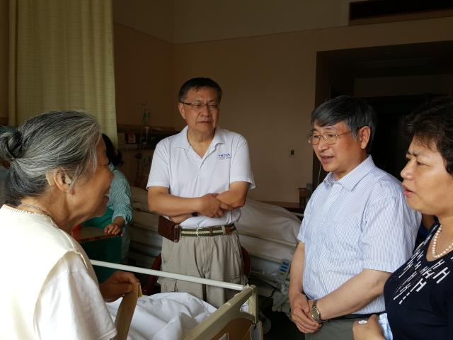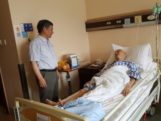 校党委副书记陈立民来到中山医院,探望重病住院的原上医老校长张镜如同志,对近阶段出现病情危重深感不安。在详知病况后关切地安抚家属要相信医院,相信医生,积极配合救治,希望张校长能转危为安;来到离休干部朱守信同志病床边,陈书记被他积极乐观与病魔抗争的精神所感动,得知他的儿女每周都会轮流来探望时,夸奖他治家有方,儿女孝顺就是福。在走访住院的老干部时,工作同志带上党总支和老干部们的深情问候,在言语中注重体恤他们的病痛,安抚焦虑不安的心情,配合医生做好解释说服工作,鼓励他们要积极治疗,提振早日康复的信心。陈放、张建国、程立、李维春、王振越等老干部及家属对良好的医疗环境、精湛的医疗技术,和谐的医患关系、组织上的真诚关爱表示由衷地感谢。