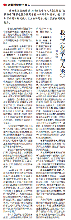 1998年4月7日,上海市高校办公室在复旦开教学工作现场会议,与会者听了《化学与人类》的两节课,评价很高。有一位高校教务处长说“听刘旦初老师上课,就像在歌剧院里听帕瓦罗蒂唱歌”。第二天《高校周刊》刊发了长篇报道《上化学课的“帕瓦罗蒂”》。高校办公室主任让我同时为财大、外贸和上外开设这门课。王生洪校长还给我写了一封信说:“静心阅读您的学生对《化学与人类》这门课的评价,如同听你您讲课一样,似饮一杯甘露。”