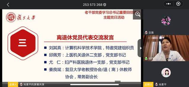 老干部党委副书记、退休教职工工作处处长周桂发回忆了在档案馆工作期间为入党积极分子、新进师生等宣讲党史、校史的经历和感悟,并在总结中指出离退休党支部要在学校党委启动的“赓续红色百年·365行动”中积极展示退而不休、奋发有为的精神风貌,离退休党员要进一步在“四史”学习教育和三全育人工作中发挥独特优势作用,在关心教育下一代的过程中将复旦精神和红色基因更好得传承下去。
